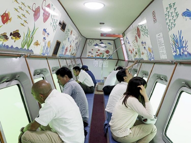 海中が見えるガラス窓がある船内展望室では水族館のように魚や海中の様子が観れるので子供